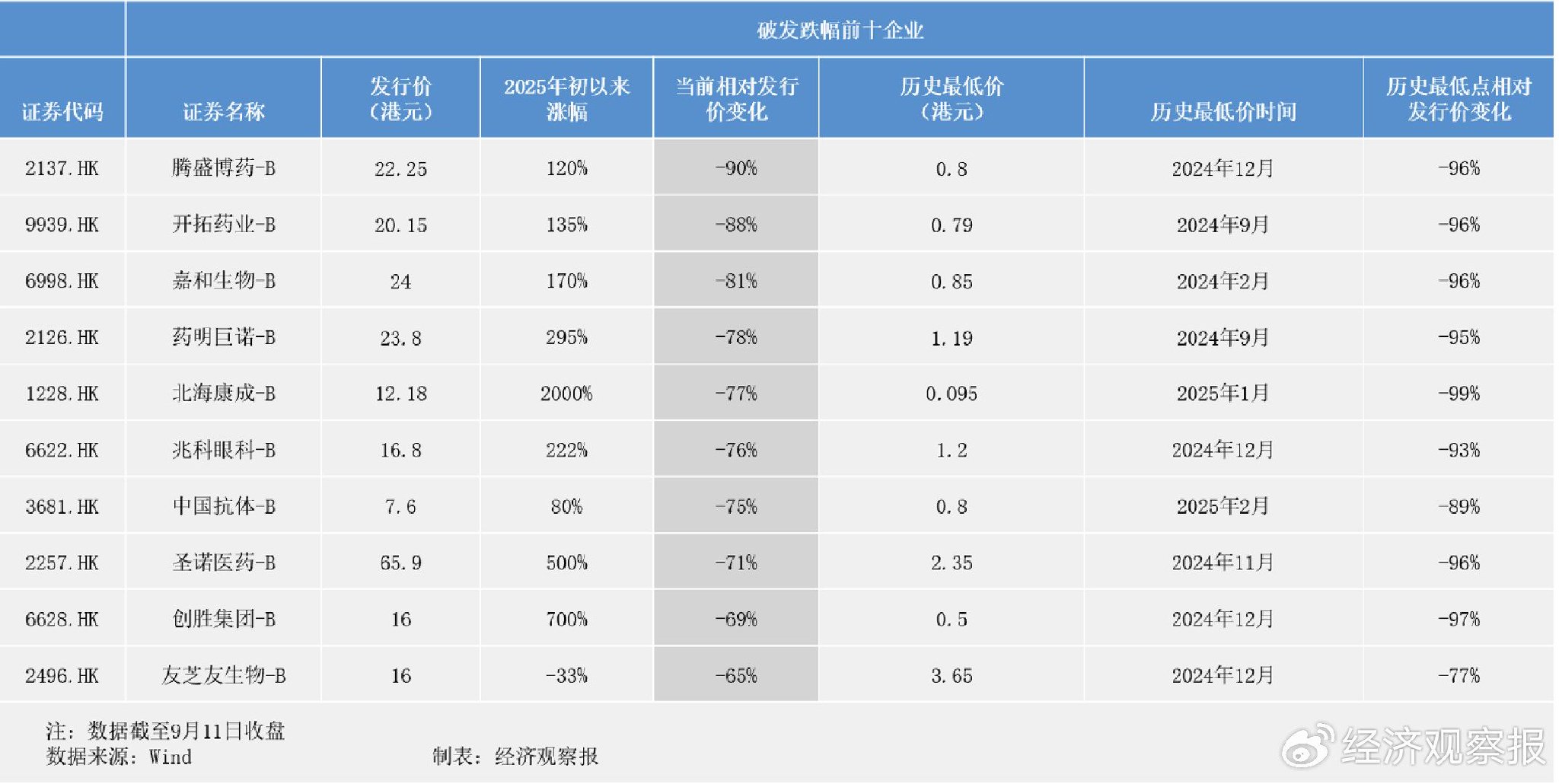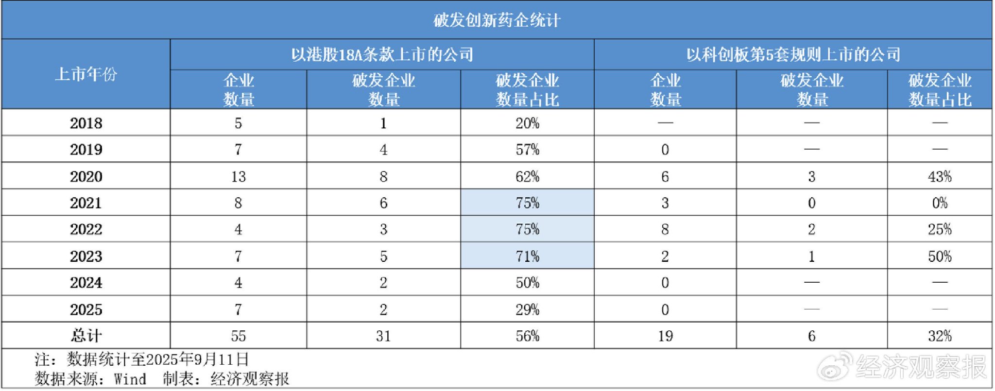 Wind数据显示,截至2025年9月11日,在55支港股18A创新药股中,有31支破发。在科创板19支创新药股中,有6支破发。