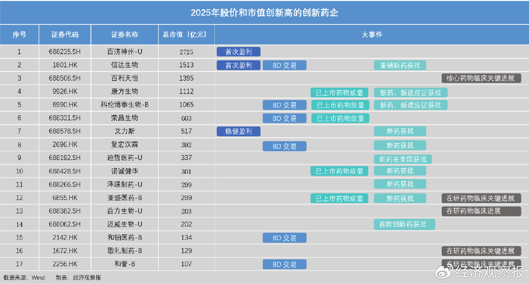 自2025年年初起,由创新药BD交易(狭义:药物对外授权)点燃的股市热情已延续了大半年。据经济观察报统计,已有17家创新药企的股价在2025年创下历史新高,包括百济神州(688235.SH)、信达生物(01801.HK)、百利天恒(688506.SH)、康方生物(09926.HK)等头部创新药企。